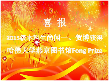 信息管理系2015级本科生尚闻一、贺博荣获2017年哈佛大学燕京图书馆Fong Prize