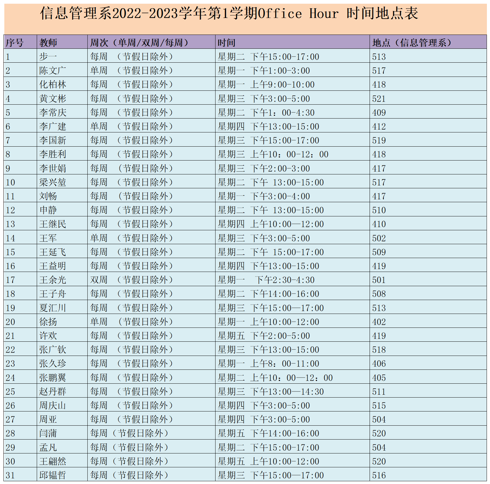信息管理系2022-2023学年第1学期Office Hour 时间地点表